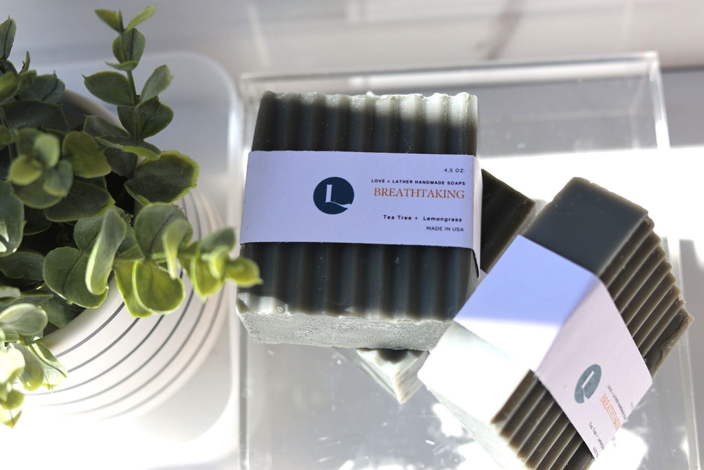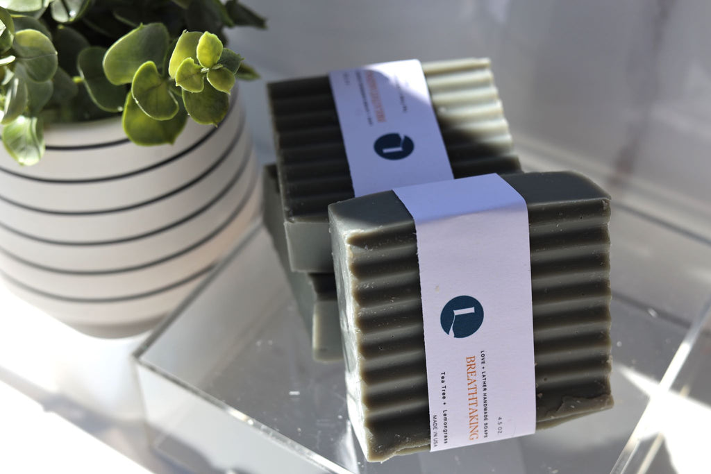 Ingredients: Cocos Nucifera (Coconut) Oil, Lard, Olea Europaea (Olive) Fruit Oil, Aqua (Water), Sodium Hydroxide (Lye), Butyrospermum Parkii (Shea Butter) Fruit, Ricinus Communis (Castor) Seed Oil, Lemongrass and Tea Tree Essential Oils and Mica Colorants.